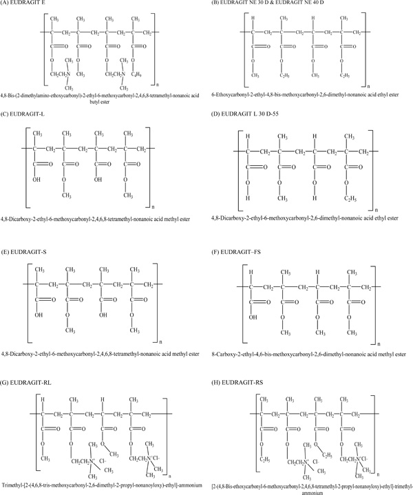 - Poly [Ethyl acrylate, methyl methacrylate, trimethylammonioethyl methacrylate chloride] with the ratio 1:2:0.1, trade names Eudragit®RS100, Eudragit®RSPO, Eudragit®RS 30D and Eudragit®RS 12.5 are manufactured and marketed by Evonik Industries, (Fig. (2h)) [33](Table 2).