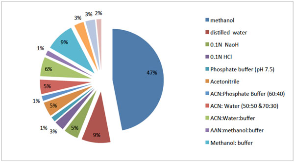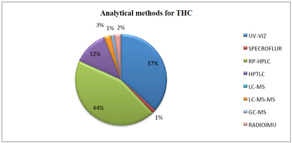 Consequently, the objective of the present review is to compile the analytical methods published so far for estimation of THC in biological samples including metabolites and degradants, bulk materials and pharmaceutical formulations. The percentage utility of these techniques is calculated and shown in Fig. (2), from which it can be noticed that High-Performance Liquid Chromatography (HPLC) and Spectrophotometric methods have been most extensively used. Apart from this, the present review will be useful for selecting the diluents Fig. (3) and the analytical procedure for the assay of THC with different concentrations ranges, selective accuracy and precision in various biological material or pharmaceuticals.