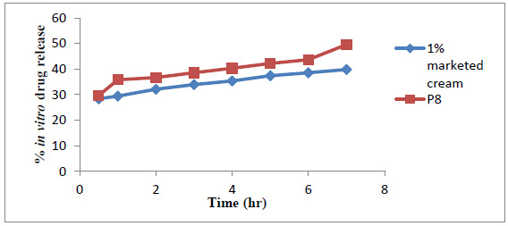 The comparative in vitro drug release data is represented graphically in Fig. (10). The cumulative percentage amount of drug release was found to be 39.83 ± 0.30 and 49.56 ± 0.11 respectively, for marketed cream and optimized niosomal gel at the end of 7 hr. Cumulative percentage release of optimized niosomal gel was quite high as compared to marketed formulation.