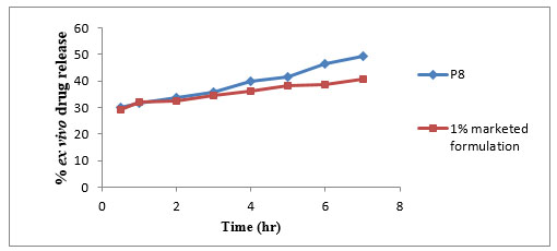 The increased drug release in case of niosomal gel is due to the non-ionic surfactant present in it, which will modify the structural composition of stratum corneum and increase the thermodynamic activity of the drug as well as skin vesicular partitioning. The % cumulative drug release of ex-vivo permeation study of optimized niosomal gel P8 (49.26%) and Marketed formulation (40.56 %) is shown in Fig. (11).