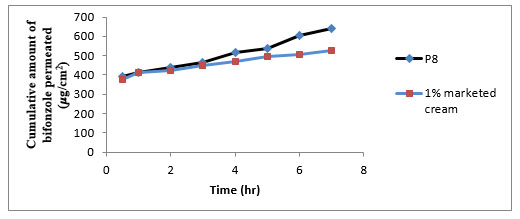 In this study the permeation data obtained from bifonazole niosomal gel (P8) was compared with 1 % marketed cream. Table 10 and Fig. (12) show skin permeation of bifonazole niosomal gel. The cumulative amount of bifonazole permeated from 1% marketed cream was low as compared to formulation P8. The flux of bifonazole from formulation P8 was high (38.12 μg/cm2/ hr) with high permeability coefficient (0.01906). The high flux (38.12 μg/cm2/ hr) in formulation P8 could be due to penetration enhancement effect of nonionic surfactants in vesicles. The enhancement ratio of formulation P8 was increased 1.8 folds.
