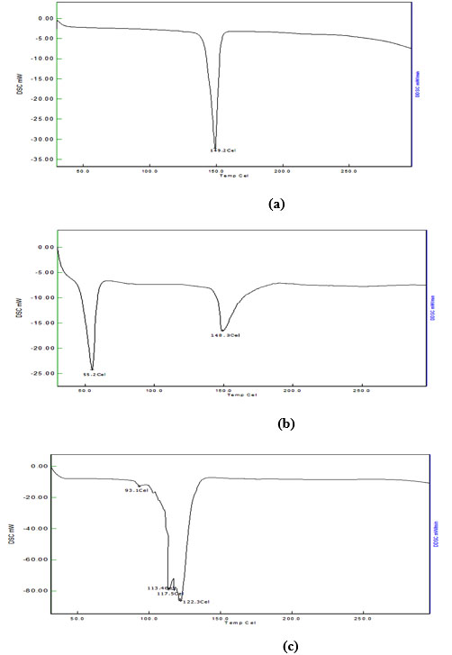 DSC measurement of bifonazole, its physical mixture with excipients and final formulation were performed with an instrument (Exstar SII, 6220 , Japan) for the measurement of thermotropic transition. Empty aluminium pans were used as reference and samples were carefully placed in another aluminium pan. The measurement was done in an inert atmosphere within the temperature range of 30ᵒC to 305ᵒC at rate of 10ᵒC per min.