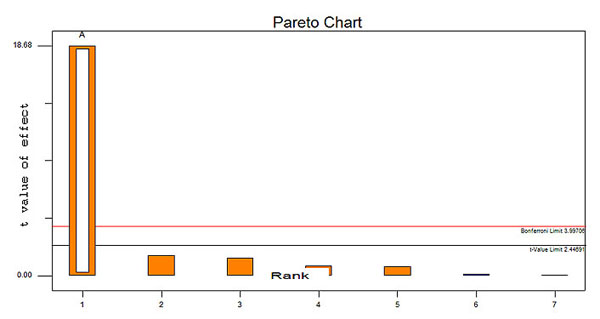 Pareto diagram showing effects of individual factors on in vitro drug release is depicted in Fig. (7). This graph shows the factor’s main effect estimates, rank order according to their significance plotted against the horizontal axis [7]. Hence, Pareto chart for the in vitro drug release study showed that the Millimole (mM) of surfactant and cholesterol (A) is the most significant variable having impact on drug release.