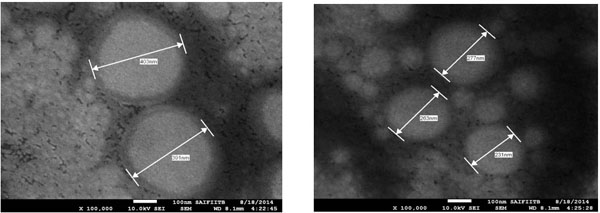 SEM photographs (Fig. 9) showed that the prepared niosome exhibited smooth surface with nano size dimension and were homogenously distributed. The diameter of the prepared niosome was in range of 231- 403 nm when seen through electron microscope.