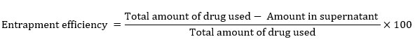 The prepared dispersion was centrifuged at 15000 rpm in refrigerated centrifuge (Remi CPR 24, Mumbai) for 30 min in order to separate entrapped drug. Further centrifuagtion supernatant was separated. The pellet obtained at bottom after centrifugation was washed with phosphate buffer pH 6.8. After further centrifugation, the wash obtained was mixed with former supernatant. The mixture was filtered and sufficiently diluted with methanol to determine the concentration of unentrapped drug spectrophotometrically at 254 nm using methanol as blank [10]. The entrapment efficiency was calculated using the following equation [11].