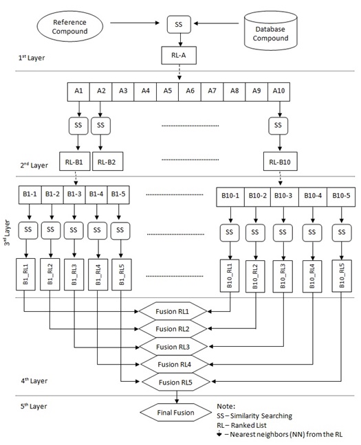 The new strategy of TSS still maintained the four important elements, which include structural representation, similarity coefficient, fusion rule and nearest neighbors except that another layer of fusion was added. Previously TSS only included three layers. The first was the initial SS, second was the separate SS for the NN and the last was the fusion layer where all results of the second layer were combined to infer final ranking. This new strategy (Fig. 5) introduced two more layers where in the second layer, SS was only executed for 10NN whose output were then used for the consecutive SS in the third layer. At this layer only top 5NN from each result set were used as input to SS. These results were then fused in the fourth and fifth layer. The fusion in the fourth layer was corresponding to the action of combining result set from SS of the same NNth position in third layer that originates from different NN inputs. The similarity coefficient (i.e. Tanimoto coefficient), and fusion rule (i.e. MAX) were constant throughout the whole experiment. This paper focuses on the performance of the three different structural representations that are being used in the new strategy.