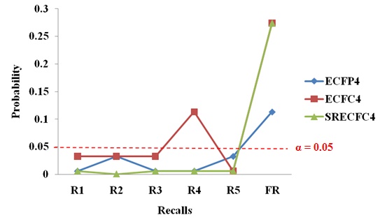 As a whole, R1 to R5 (recalls at the fourth layer) generated significant results in all the three types of fingerprints, as shown in Fig. (7). Results at the fourth layer are more significant than results at the fifth layer as the FR (fifth layer’s results) only provide nearly significant results. Hence, there is no useful meaning in adding the final layer to the new strategy as the recalls gained at the fourth layer have already shown statistically significant results. The results at the fourth layer did not solely occur due to chance.