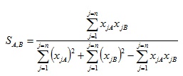 where xjA and xjB are the values of the jth attribute in objects A and B, respectively. The length of fingerprints is symbolized by n which is the total number of attributes of an object. Note that object in our case are structures under considerations and that all values xjA, xjB are non-negative fragments occurrence weights.