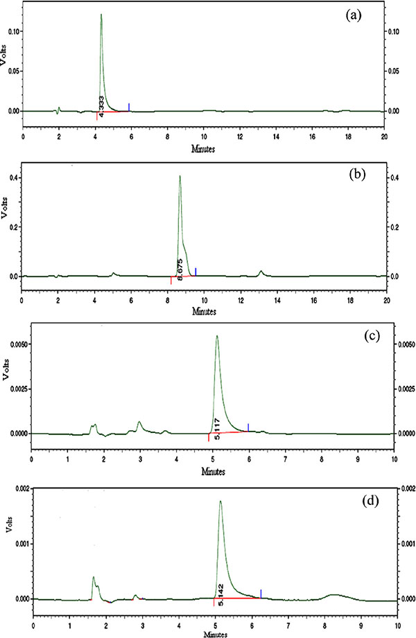Fig. (2). Typical chromatogram of bromazepam (a), degraded bromazepam (b), and bromazepam chelated with copper (II) at 284 nm (c) and at 309 nm (d). |